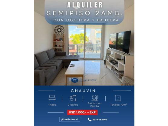 Alquiler 24 meses Semipiso ubicado en vereda de sol, en el barrio Chauvin, (2) ambientes, a la CALLE, balcon con parrilla, cochera y baulera.